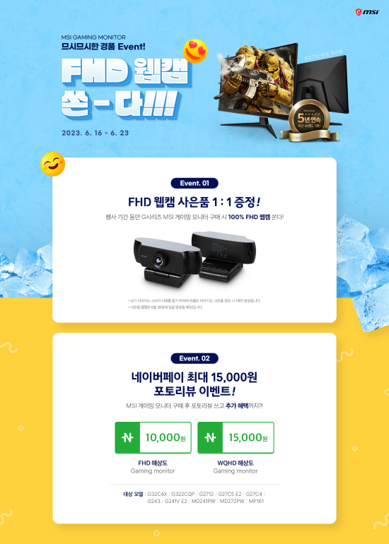 2023³â 6¿ù 16ÀϺÎÅÍ 23ÀϱîÁö ÁøÇàµÇ´Â À̹ø MSI ±âȹÀüÀº MSI Àα⠰ÔÀ̹֡¤ºñÁî´Ï½º ¸ð´ÏÅÍ ´ë»óÀ¸·Î MSI ÀÚü ÇÒÀÎ ÇýÅðú ÇÔ²² ¿Â¶óÀÎ ¹ÌÆÃ¿¡ ÇÊ¿äÇÑ FHD À¥Ä· 1:1 ÁõÁ¤À¸·Î ÁøÇàµÈ´Ù.