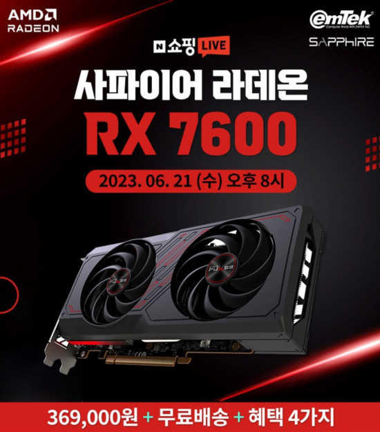ÀÌ¿¥ÅؾÆÀÌ¿£¾¾Àº 6¿ù 21ÀÏ(¼ö) Àú³á 8½Ã¿¡ SAPPHIRE ¶óµ¥¿Â RX 7600 PULSE OC D6 8GBÀ» ³×À̹ö ¼îÇÎ ¶óÀ̺긦 ÁøÇàÇÑ´Ù ¹àÇû´Ù.