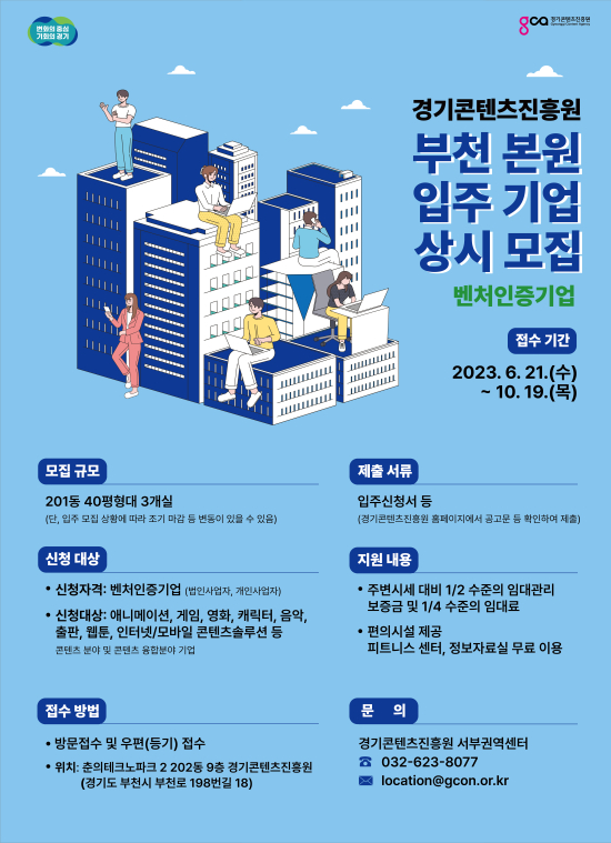 °æ±âÄÜÅÙÃ÷ÁøÈï¿ø(ÀÌÇÏ °æÄÜÁø)ÀÌ °æÄÜÁø ºÎõ º»¿ø¿¡ ½Å±Ô ÀÔÁÖÇÒ ±â¾÷À» 10¿ù 19ÀϱîÁö »ó½Ã ¸ðÁýÇÑ´Ù. ¸ðÁý ´ë»ó ±â¾÷Àº ¾Ö´Ï¸ÞÀ̼Ç, °ÔÀÓ, ¿µÈ, À½¾Ç, ij¸¯ÅÍ, ÃâÆÇ, À¥Å÷, ÀÎÅͳÝ/¸ð¹ÙÀÏ ÄÜÅÙÃ÷¼Ö·ç¼Ç µî ÄÜÅÙÃ÷ (À¶ÇÕ)ºÐ¾ß¿¡¼ º¥Ã³ÀÎÁõÀ» ¹ÞÀº ¹ýÀÎ ¶Ç´Â °³ÀÎÀÌ´Ù.
