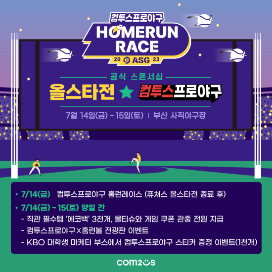 ÄÄÅõ½º´Â 7¿ù 14Àϰú 15ÀÏ ¾çÀÏ¿¡ °ÉÃÄ °³ÃֵǴ ¡®KBO ¿Ã½ºÅ¸Àü¡¯ Áß 14ÀÏ ¡®¿Ã½ºÅ¸ ÇÁ¶óÀ̵¥ÀÌ¡¯ÀÇ ¸ÞÀÎ À̺¥Æ®·Î ¡®ÄÄÅõ½ºÇÁ·Î¾ß±¸ Ȩ·±·¹À̽º¡¯¸¦ ÁøÇàÇÑ´Ù.
