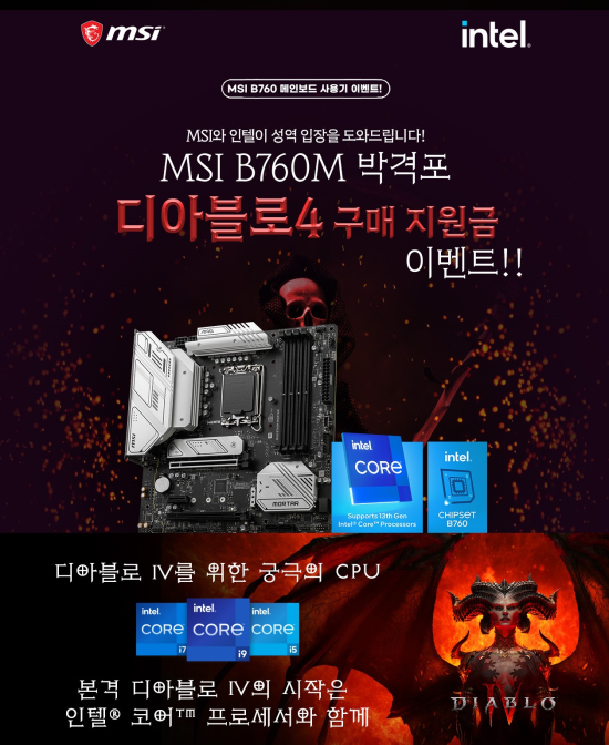7¿ù 1ÀÏ(Åä)ºÎÅÍ 31ÀÏ(¿ù)±îÁö ÁøÇàµÇ´Â º» À̺¥Æ®´Â ±¹³»¿¡ Á¤½ÄÀ¸·Î À¯ÅëµÈ MSI B760M ¹Ú°ÝÆ÷ ¹× ¹Ú°ÝÆ÷ ¸Æ½º WIFI¿Í ÀÎÅÚ 13¼¼´ë i5 ÀÌ»óÀÇ ÇÁ·Î¼¼¼¸¦ ±¸¸ÅÇÑ °í°´À̶ó¸é ´©±¸³ª Âü¿©ÇÒ ¼ö ÀÖÀ¸¸ç, ¡®µð¾Æºí·Î 4¡¯¸¦ ºñ·ÔÇÑ Àα⠰ÔÀÓÀ» ±¸¸ÅÇÒ ¼ö ÀÖ´Â 2¸¸¿ø »óǰ±ÇÀ» °æÇ°À¸·Î Áö±ÞÇÑ´Ù. À̺¥Æ® Âü¿© ¹æ¹ý ¹× ÁÖÀÇ»çÇ׿¡ ´ëÇÑ ¾È³»´Â ³×À̹ö MSI »ç¿ëÀÚ Ä«Æä¸¦ ÅëÇØ È®ÀÎÀÌ °¡´ÉÇÏ´Ù.
