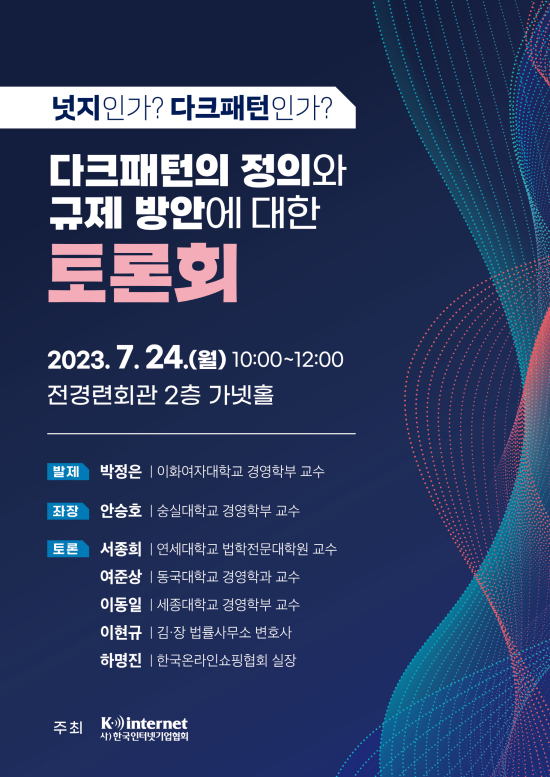 Çѱ¹ÀÎÅͳݱâ¾÷Çùȸ°¡ ÁÖÃÖÇÏ´Â ¡°³ÓÁöÀΰ¡? ´ÙÅ©ÆÐÅÏÀΰ¡?-´ÙÅ©ÆÐÅÏÀÇ Á¤ÀÇ¿Í ±ÔÁ¦ ¹æ¾È¿¡ ´ëÇÑ Åä·Ðȸ¡±°¡ ¿À´Â 7¿ù 24ÀÏ(¿ù) ¿ÀÀü 10½Ã¿¡ Àü°æ·Ãȸ°ü ÄÁÆÛ·±½º¼¾ÅÍ 2Ãþ °¡³ÝȦ¿¡¼ °³ÃֵȴÙ.