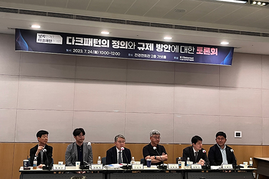 Çѱ¹ÀÎÅͳݱâ¾÷Çùȸ´Â 7¿ù 24ÀÏ Àü°æ·Ãȸ°ü ÄÁÆÛ·±½º¼¾ÅÍ 2Ãþ °¡³ÝȦ¿¡¼ ¡®³ÓÁöÀΰ¡? ´ÙÅ©ÆÐÅÏÀΰ¡? ´ÙÅ©ÆÐÅÏÀÇ Á¤ÀÇ¿Í ±ÔÁ¦ ¹æ¾È¿¡ ´ëÇÑ Åä·Ðȸ¡¯¸¦ ¿¾ú´Ù. ¡®´ÙÅ©ÆÐÅÏ¡¯Àº ÈçÈ÷ À¥»çÀÌÆ®¿Í ¾Û »ó¿¡¼ ¼ÒºñÀÚ¸¦ ¼ÓÀ̱â À§ÇØ ¼³°èµÈ »ç¿ëÀÚ ÀÎÅÍÆäÀ̽º·Î Åë¿ëµÈ´Ù. À̳¯ Åä·Ðȸ¿¡¼´Â °¢ ºÐ¾ß Àü¹®°¡µéÀÌ ¸ð¿© ´ÙÅ©ÆÐÅÏÀÇ ¼º±ÞÇÑ ÀÔ¹ý¿¡ ´ëÇÑ ¿ì·ÁÁ¡À» ÁöÀûÇÏ°í ¹Ù¶÷Á÷ÇÑ ±ÔÁ¦ ¹æ¾È¿¡ ´ëÇØ ³íÀÇÇß´Ù.