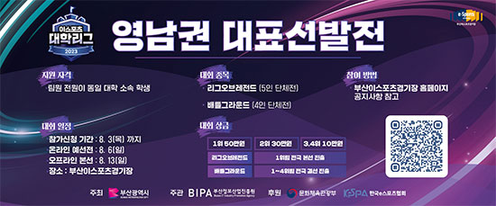 ºÎ»ê±¤¿ª½Ã(ºÎ»ê½Ã)¿Í (Àç)ºÎ»êÁ¤º¸»ê¾÷ÁøÈï¿ø(ÁøÈï¿ø)Àº e½ºÆ÷Ã÷¸¦ ÅëÇÑ ´ëÇÐ °£ ±³·ù È®´ë ¹× ´ëÇÐ ³» e½ºÆ÷Ã÷ ¹®È Ȱ¼ºÈ¸¦ À§ÇÏ¿© ¿À´Â 8¿ù¡¸2023 À̽ºÆ÷Ã÷ ´ëÇи®±× ¿µ³²±Ç ´ëÇ¥ ¼±¹ßÀü¡¹À» ºÎ»êÀ̽ºÆ÷Ã÷°æ±âÀå(ºê·¹³ª)¿¡¼ °³ÃÖÇÑ´Ù°í ¹àÇû´Ù.