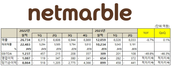 ³Ý¸¶ºíÀº ¿ÃÇØ 2ºÐ±â ¿¬°á±âÁØÀ¸·Î ¸ÅÃâ 6,033¾ï¿ø(YoY -8.7%, QoQ 0.1%), EBITDA 108¾ï¿ø(YoY -49.8%, QoQ -46.3%), ¿µ¾÷¼Õ½Ç 372¾ï¿ø(YoY ÀûÀÚÁö¼Ó, QoQ ÀûÀÚÁö¼Ó), ´ç±â¼ø¼Õ½Ç 441¾ï¿ø(YoY ÀûÀÚÁö¼Ó, QoQ ÀûÀÚÁö¼Ó)À» ±â·ÏÇß´Ù°í 8ÀÏ ¹àÇû´Ù.