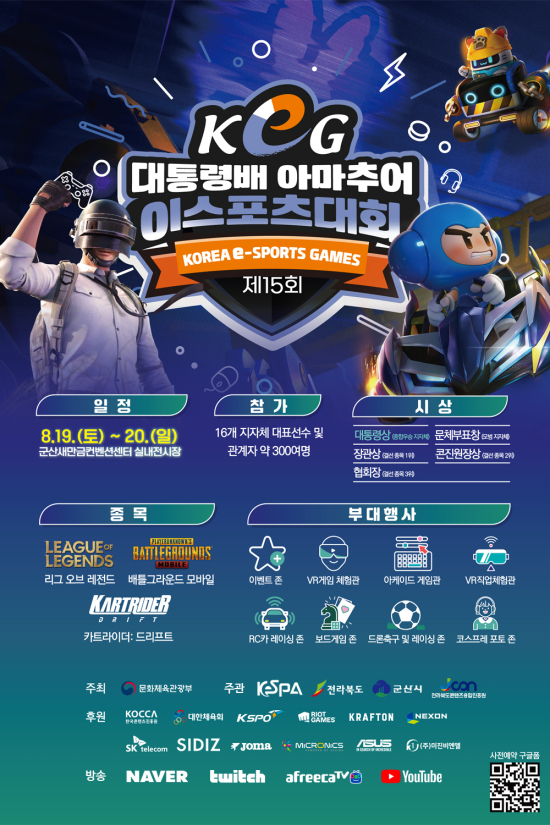 ¹®ÈüÀ°°ü±¤ºÎ°¡ ÁÖÃÖÇϰí Çùȸ¿Í Àü¶óºÏµµ, ±º»ê½Ã, Àü¶óºÏµµÄÜÅÙÃ÷À¶ÇÕÁøÈï¿øÀÌ ÁÖ°ü, Çѱ¹ÄÜÅÙÃ÷ÁøÈï¿ø, ´ëÇÑüÀ°È¸, ±¹¹ÎüÀ°ÁøÈï°ø´Ü, ¶óÀ̾ù °ÔÀÓÁî, Å©·¡ÇÁÅæ, ³Ø½¼ÄÚ¸®¾Æ, SKÅÚ·¹ÄÞ, ½ÃµðÁî, Á¶¸¶, ¸¶ÀÌÅ©·Î´Ð½º, ¿¡À̼ö½º, ¹ÌÁøºñ¿£¿¤ÀÌ ÈÄ¿øÇÏ´Â Á¦15ȸ ¡®´ëÅë·É¹è ¾Æ¸¶Ãß¾î À̽ºÆ÷Ã÷ ´ëȸ¡¯(KOREA e-SPORTS GAMES, ÀÌÇÏ ´ëÅë·É¹è KeG)ÀÇ ¡®Áö¿ª ´ëÇ¥ ¼±¹ßÀü¡¯ÀÌ Áö³ 7¿ù ÇÑ ´Þ°£ Àü±¹ 16°³ Áö¿ª¿¡¼ ¿Ï·áµÆ´Ù. ±× °á°ú ÃÑ 172¸íÀÇ Áö¿ª ´ëÇ¥°¡ Âü°¡ÇÏ´Â ´ëÅë·É¹è KeG ¡®Àü±¹ °á¼±¡¯ÀÌ 8¿ù 19ÀÏ(Åä), 20ÀÏ(ÀÏ) ¾çÀϰ£ ±º»ê»õ¸¸±ÝÄÁº¥¼Ç¼¾ÅÍ ½Ç³»Àü½ÃÀå(Àü¶óºÏµµ ±º»ê)¿¡¼ ¿¸°´Ù.