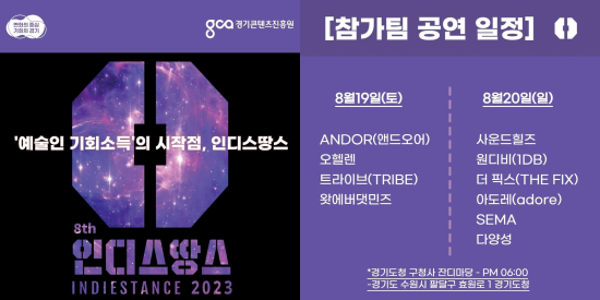 °æ±âÄÜÅÙÃ÷ÁøÈï¿øÀº ¿ì¼ö Àεð¹ÂÁö¼Ç ¹ß±¼ ¿Àµð¼Ç ¡®2023 Àε𽺶¥½º¡¯ÀÇ TOP10 º»¼± °æ¿¬À» 8¿ù 19ÀÏ(Åä)ºÎÅÍ 8¿ù 20ÀÏ(ÀÏ)±îÁö ¾çÀÏ ¿ÀÈÄ 6½Ã¿¡ ¼ö¿ø½Ã °æ±âµµÃ» ±¸Ã»»ç¿¡¼ °³ÃÖÇÑ´Ù°í ¹àÇû´Ù.