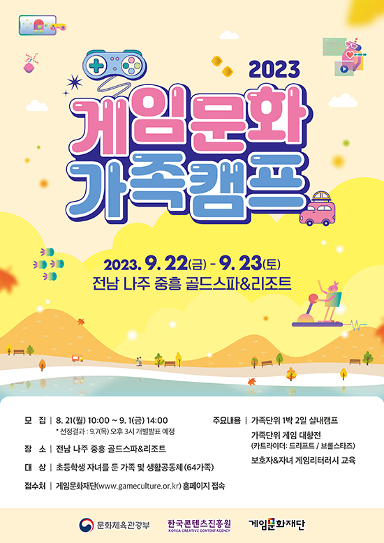 ¹®È­Ã¼À°°ü±¤ºÎ, Çѱ¹ÄÜÅÙÃ÷ÁøÈï¿ø, °ÔÀÓ¹®È­Àç´ÜÀº ¿À´Â 9¿ù 22ÀÏ ±Ý¿äÀϺÎÅÍ 23ÀÏ Åä¿äÀϱîÁö 1¹Ú 2Àϰ£ Àü³² ³ªÁÖ¿¡¼­ ¡®3ȸÂ÷ °ÔÀÓ¹®È­ °¡Á·Ä·ÇÁ¡¯¸¦ °³ÃÖÇÑ´Ù. ¿Â °¡Á·ÀÌ ÇÔ²² Áñ±æ ¼ö ÀÖ´Â ¿©°¡¹®È­·Î °ÔÀÓÀ» ¾î¶»°Ô Ȱ¿ëÇÒ ¼ö ÀÖ´ÂÁö üÇèÇÏ°í ¹è¿öº¸´Â º» Ä·ÇÁ´Â ÃʵîÇлýÀÌ Æ÷ÇÔµÈ Á÷°è°¡Á· ¶Ç´Â »ýȰ°øµ¿Ã¼¸¦ Âü°¡ ´ë»óÀ¸·Î ÇÑ´Ù. ÁÖ¿ä ÇÁ·Î±×·¥À¸·Î´Â ¸ðµç ¼¼´ë°¡ ÇÔ²² Áñ±æ ¼ö ÀÖ´Â ¡ã°ÔÀÓ¹®È­ ÄûÁî´ëȸ ¡ã°¡Á·´ëÇ× e½ºÆ÷Ã÷ ´ëȸ ¡ãº¸È£ÀÚ °ÔÀÓ¸®ÅÍ·¯½Ã ±³À° ¡ãÀÚ³à º¸µå°ÔÀÓ Ã¼Çè±³À° ¡ã·¹Æ®·Î °ÔÀÓºÎÅÍ ÃֽЏð¼Ç °ÔÀÓ±îÁö Áñ±æ ¼ö ÀÖ´Â °ÔÀÓ¹®È­Ã¼ÇèÁ¸ÀÌ ¿î¿µµÇ¸ç ±× ¿Ü¿¡ ´Ùä·Î¿î À̺¥Æ®°¡ ÇÔ²² Á¦°øµÈ´Ù.