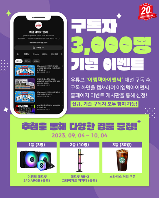 ÀÌ¿¥ÅؾÆÀÌ¿£¾¾(ÀÌ¿¥ÅØ)´Â 2023³â 9¿ù 4ÀϺÎÅÍ 2023³â 10¿ù 4ÀϱîÁö ÀÌ¿¥ÅØ °ø½Ä À¯Æ©ºê ±¸µ¶ÀÚ 3õ¸í ´Þ¼ºÀ» ±â³äÇÏ¿© ÀÌ¿¥ÅØ È¨ÆäÀÌÁö¸¦ ÅëÇØ À¯Æ©ºê ±¸µ¶ ÀÎÁõ ȸ¿øÀ» ´ë»óÀ¸·Î 5¸¸¿ø »ó´çÀÇ ·¹µåºø 240 ARGB ¼ö·©Äð·¯¿Í ·¹µåºø RB-2 ARGB ±×·¡ÇÈÄ«µå ÁöÁö´ë ¹× ½ºÅ¸¹÷½º Ä¿ÇÇ ÄíÆùÀ» Ãß÷ ÁõÁ¤ÇÏ´Â À̺¥Æ®¸¦ ÁøÇà ÇÑ´Ù°í ¹àÇû´Ù.