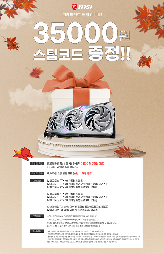 À̹ø Çà»ç´Â 2023³â 9¿ù 1ÀϺÎÅÍ 9¿ù 30ÀϱîÁö MSI ±×·¡ÇÈÄ«µå¸¦ ±¸¸ÅÇϰí Á¦Ç° µî·ÏÀ» ¸¶Ä£ °í°´À» ´ë»óÀ¸·Î ÁøÇàµÇ¸ç À̺¥Æ® ´ë»ó Á¦Ç°Àº ¾Æ·¡¿Í °°´Ù.