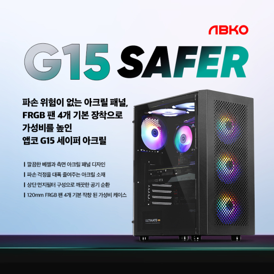 ¾ÛÄÚ¿¡¼ ¾ÆÅ©¸± ¼ÒÀ縦 ±ò²ûÇÑ µðÀÚÀÎÀ¸·Î Ãø¸é ÆÐ³Î¿¡ ³ì¿©³½ ¡®¾ÛÄÚ G15 ¼¼ÀÌÆÛ ¾ÆÅ©¸±¡¯À» Ãâ½ÃÇß´Ù. ¡®¾ÛÄÚ G15 ¼¼ÀÌÆÛ ¾ÆÅ©¸±¡¯ ÄÉÀ̽º´Â °¡Àå ¸¹ÀÌ »ç¿ëµÇ´Â ATX ±Ô°ÝÀÇ ¸ÞÀκ¸µå¸¦ ÀåÂøÇÒ ¼ö ÀÖ´Â ¹ÌµéŸ¿ö ÄÉÀ̽º·Î, ±ò²ûÇÑ Ãø¸é ¾ÆÅ©¸± ÆÐ³Î°ú º¸´Ù °¡º¿î ¹«°Ô¸¦ °®Ãß°í ÀÖÀ½°ú µ¿½Ã¿¡ °ÔÀÌ¹Ö PC ÄÉÀ̽º·Î¼ÀÇ ²À ÇÊ¿äÇÑ ¿ä¼ÒµéÀ» Àû±Ø ¹Ý¿µÇÏ°í ºÒÇÊ¿äÇÑ ¿ä¼ÒµéÀº ¹èÁ¦ÇÔÀ¸·Î½á ÇÕ¸®ÀûÀÎ °¡°ÝÀ¸·Î Ãâ½ÃµÇ¾ú´Ù.