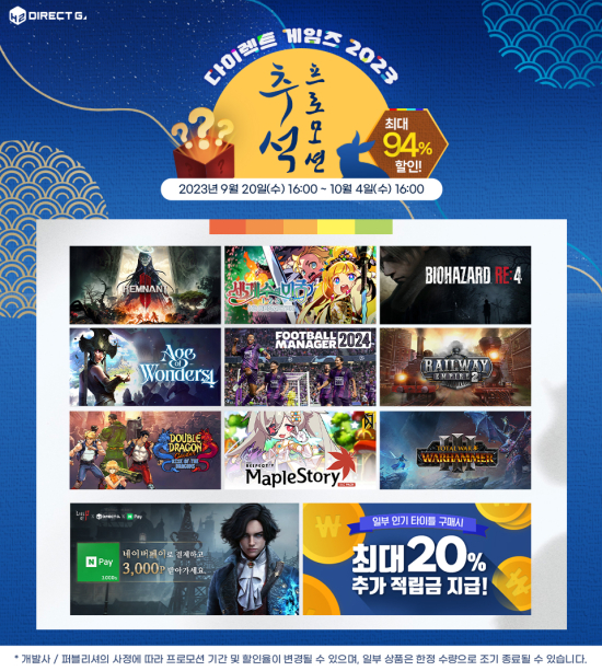 ´Ù¾çÇÑ ½ÅÀÛ ¹× Àα⠰ÔÀÓÀ» ÃÖ´ë 94% ÇÒÀÎµÈ °¡°Ý¿¡ ±¸¸ÅÇÒ ¼ö ÀÖ´Â ´ÙÀÌ·ºÆ® °ÔÀÓÁî Ãß¼® ÇÁ·Î¸ð¼ÇÀº ¿À´Ã ¿ÀÈÄ 4½ÃºÎÅÍ 10¿ù 4ÀÏ ¿ÀÈÄ 4½Ã±îÁö ÁøÇàµÇ¸ç, ¿À´Â 9¿ù 28ÀÏ Çѱ¹¾î ¾÷µ¥ÀÌÆ®°¡ Á¤½Ä Áö¿øµÉ ¿¹Á¤ÀÎ ·¹ÀÏ¿þÀÌ ¿¥ÆÄÀ̾î 2, ·½³ÍÆ® 2, ¿¡ÀÌÁö ¿Àºê ¿ø´õ 4, ¹ÙÀÌ¿ÀÇÏÀÚµå RE:4, ´õºí µå·¡°ï ¿ÜÀü: ¶óÀÌÁî ¿Àºê ´õ µå·¡°ï, ¼¼°è¼öÀÇ ¹Ì±Ã HD ¸®¸¶½ºÅÍ, µðÁ¦À̸ƽº ¸®½ºÆåÆ® V, ÅäÅ» ¿ö: ¿öÇØ¸Ó 3 µî ½ÅÀÛ°ú Àαâ ŸÀÌÆ²À» ÇÒÀÎµÈ °¡°Ý¿¡ ¸¸³ªº¼ ¼ö ÀÖ´Ù.