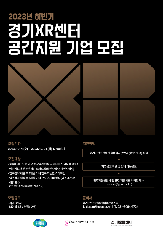 °æ±âÄÜÅÙÃ÷ÁøÈï¿ø(ÀÌÇÏ °æÄÜÁø)Àº ¿À´Â 10¿ù 31ÀϱîÁö °æ±âXR(eXtended Reality, °¡»ó¡¤Áõ°Çö½ÇÀ» Æ÷ÇÔÇÑ È®ÀåÇö½Ç ½Ç°¨±â¼ú)¼¾ÅÍ °ø°£Áö¿ø ÀÔÁÖ±â¾÷À» ¸ðÁýÇÑ´Ù°í ¹àÇû´Ù.