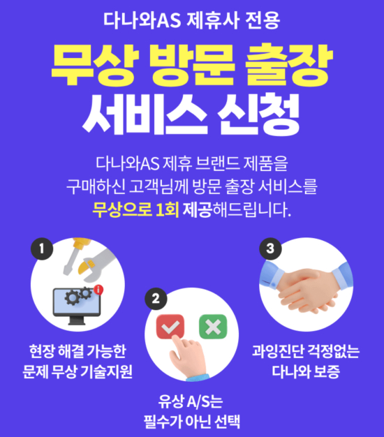 ´Ù³ª¿ÍA/S Á¦ÈÞ ºê·£µå Á¦Ç°À» ±¸¸ÅÇÑ ¼ÒºñÀÚµéÀ» ´ë»óÀ¸·Î Á¦°øµÇ´Â ¹«»ó 1ȸ ÃâÀå ¼­ºñ½º´Â, ´Ù³ª¿Í Çù·Â¾÷üÀÇ Àü¹® ¿£Áö´Ï¾î°¡ ÇöÀåÀ» ¹æ¹®ÇÏ¿© º¸´Ù ºü¸£°í ÆíÇÏ°Ô PC¸¦ Áø´ÜÇÏ°í ¹®Á¦¸¦ È®½ÇÇÏ°Ô ÇØ°áÇÒ ¼ö ÀÖ´Â A/S ¼Ö·ç¼ÇÀÌ´Ù.