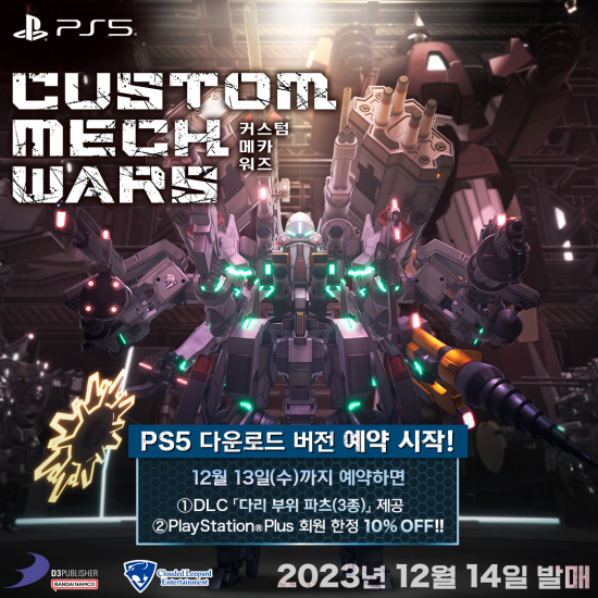 ÁÖ½Äȸ»ç Ŭ¶ó¿ìµðµå ·¹¿ÀÆÄµå ¿£ÅÍÅ×ÀÎ¸ÕÆ®(Clouded Leopard Entertainment)´Â ÁÖ½Äȸ»ç D3PUBLISHER INC°¡ ÀϺ»¿¡¼ ¹ß¸ÅÇÏ´Â ¸¶°³Á¶ ¸ÞÄ« ¾×¼Ç ½´ÆÃ ¡ºCUSTOM MECH WARS -Ä¿½ºÅÒ ¸ÞÄ« ¿öÁî-¡»(´ëÀÀ ±âÁ¾: PlayStation¢ç5)ÀÇ ¾Æ½Ã¾Æ ·ÎÄöóÀÌ¡ ¹öÀüÀÇ »çÀü ¿¹¾àÀ» ½Ç½ÃÇÑ´Ù. º» »çÀü ¿¹¾àÀº ´Ù¿î·Îµå ¹öÀüÀ» ´ë»óÀ¸·Î 2023³â 11¿ù 9ÀÏ(¸ñ)ºÎÅÍ PlayStation¢âStore¿¡¼ °³½ÃÇÑ´Ù.