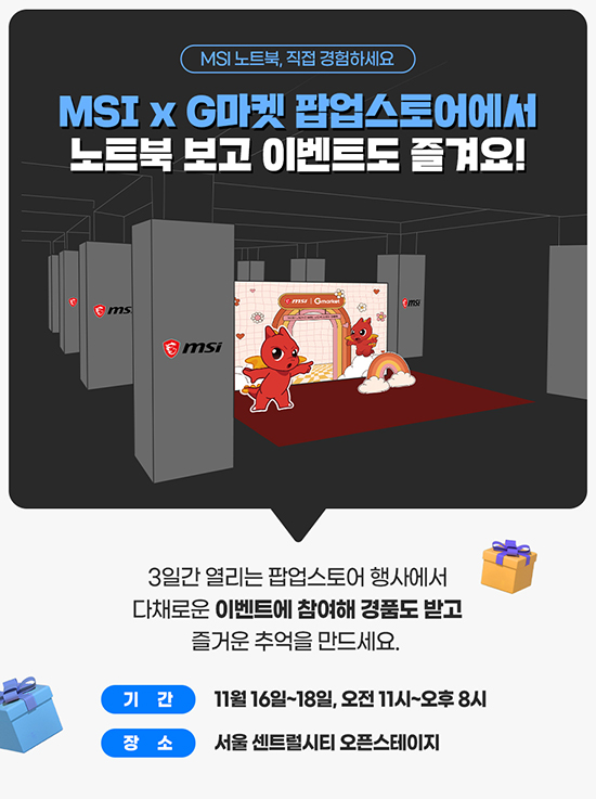 ¡®MSI ³ëÆ®ºÏ X G¸¶ÄÏ ÆË¾÷½ºÅä¾î¡¯´Â ÃÖ´ë ¼º¼ö±âÀÎ ¿¬¸»À» ¸Â¾Æ G¸¶ÄÏ ¡®ºò½º¸¶Àϵ¥ÀÌ¡¯¿¡ Âü°¡ÇÏ´Â MSI ÀÎ±â ³ëÆ®ºÏÀ» Á÷Á¢ üÇèÇØ º¼ ¼ö ÀÖµµ·Ï ÆË¾÷ ÇüÅÂÀÇ Àü½Ã°ø°£À¸·Î ²Ù¸çÁ³´Ù. üÇèÁ¸¿¡¼´Â ¿ë¿ëÀÌ Æ÷ÅäÁ¸, ÀνºÅ¸±×·¥ ÆÈ·Î¿ì À̺¥Æ®, ·ê·¿ °ÔÀÓ µî ´Ù¾çÇÑ ÇÁ·Î±×·¥°ú ÇÔ²² ǪÁüÇÑ °æÇ° ÁõÁ¤ Çà»ç°¡ ÁøÇàµÉ ¿¹Á¤ÀÌ´Ù. ƯÈ÷, 1ÀÏ ¼±Âø¼ø 200¸í¾¿ ¼öÇèÇ¥¸¦ ÀÎÁõÇϰí MSI µµÀåÀ» ¹ÞÀ¸¸é ¼±¹° ²Ù·¯¹Ì¸¦ ÁõÁ¤ÇÏ´Â ´ëÇмöÇдɷ½ÃÇè ¼öÇè»ýÀ» À§ÇÑ À̺¥Æ®µµ ¸¶·ÃµÆ´Ù.