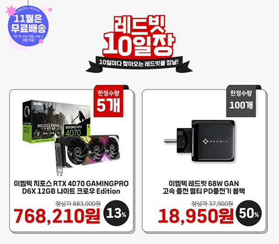 11¿ù 20ÀÏ(¿ù) ¿ÀÀü 9½Ã¿¡ ½ÃÀÛÇÏ´Â ·¹µåºø 10ÀÏ ÀåÀÇ Ç׸ñÀº GPU, ¸Þ¸ð¸® ¿Âµµ¿Í Àü·Â ¼Ò¸ð·®¿¡ µû¶ó ½º¸¶Æ®ÇÏ°Ô ÀÛµ¿ÇÏ´Â 0-dB ÆÒ ±â´É°ú ´ëÇü ¾Ë·ç¹Ì´½ ¹æ¿ÆÇ°ú 4°³ÀÇ È÷Æ® ÆÄÀÌÇÁ¸¦ ±¸¼ºÇÏ¿© °ø±â ¼øÈ¯ ¹× ³Ã°¢ ¼º´ÉÀ» Å©°Ô Çâ»óÇØ °ÔÀ̹ÖÀ» À§ÇÑ È¿À²ÀûÀÎ Ä𸵠½Ã½ºÅÛÀ¸·Î ¾î¶°ÇÑ »óȲ¿¡µµ ¾ÈÁ¤ÀûÀÎ ¼º´ÉÀ» º¸ÀåÇÏ´Â RTX 4070 Series·Î Iron-black°ú Silver-grey°¡ È¥ÇÕµÇ¾î ¼¼·ÃµÈ ¿ÜÇü À̹ÌÁö¸¦ ¿¬ÃâÇÏ´Â ¡°ÀÌ¿¥ÅØ ÁöÆ÷½º RTX 4070 GAMINGPRO D6X 12GB ³ªÀÌÆ® Å©·Î¿ì Edition¡± Á¦Ç°°ú QC4+, PD 3.0, PPSÀÇ ±â´É žÀç·Î ´Ù¾çÇÑ ±â±â¸¦ 4Æ÷Æ®·Î ÃÖ´ë 68W¸¦ Ãâ·ÂÇÏ´Â ¡°ÀÌ¿¥ÅØ ·¹µåºø 68W GAN °í¼Ó ÃæÀü ¸ÖƼ PDÃæÀü±â ÈÀÌÆ®¡± Á¦Ç° ÇÒÀÎ Çà»ç¸¦ ÁøÇàÇÑ´Ù.