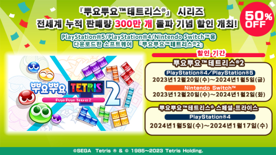 ¼¼°¡ÆÛºí¸®½ÌÄÚ¸®¾Æ´Â ¡º»Ñ¿ä»Ñ¿ä¢âÅׯ®¸®½º¢ç¡» ½Ã¸®Áî°¡ Àü¼¼°è ´©Àû ÆÇ¸Å·® 300¸¸ °³¸¦ µ¹ÆÄÇß´Ù°í ÀüÇß´Ù. À̸¦ ±â³äÇÏ¿©, PlayStation¢âStore ¹× ´ÑÅÙµµ e¼ó¿¡¼ ÆÇ¸Å ÁßÀÎ PlayStation¢ç5/PlayStation¢ç4/Nintendo Switch¢â¿ë ´Ù¿î·ÎµåÆÇ ¼ÒÇÁÆ®¿þ¾î ¡º»Ñ¿ä»Ñ¿ä¢âÅׯ®¸®½º¢ç¡» ½Ã¸®ÁîÀÇ ÀϺθ¦ ±â°£ ÇÑÁ¤À¸·Î 50% ÇÒÀÎµÈ °¡°Ý¿¡ ÆÇ¸ÅÇÑ´Ù.