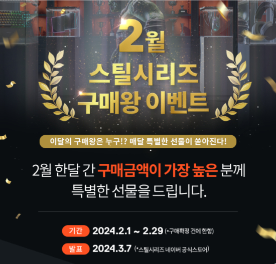 ½ºÆ¿½Ã¸®Áî (SteelSeries)°¡ 2¿ù ÇÑ ´Þ°£ ±¸¸Å±Ý¾×ÀÌ °¡Àå ³ôÀº »ç¶÷À» ¼±Á¤ÇØ Æ¯º°ÇÑ ¼±¹°À» Á¦°øÇÏ´Â ¡®2¿ù ½ºÆ¿½Ã¸®Áî ±¸¸Å¿Õ À̺¥Æ®¡¯¸¦ ½ÃÀÛÇß´Ù. ±Ý¹ø À̺¥Æ®´Â ½ºÆ¿½Ã¸®Áî ³×À̹ö °ø½Ä½ºÅä¾î¿¡¼ ÁøÇàµÇ°í ÀÖ´Ù.