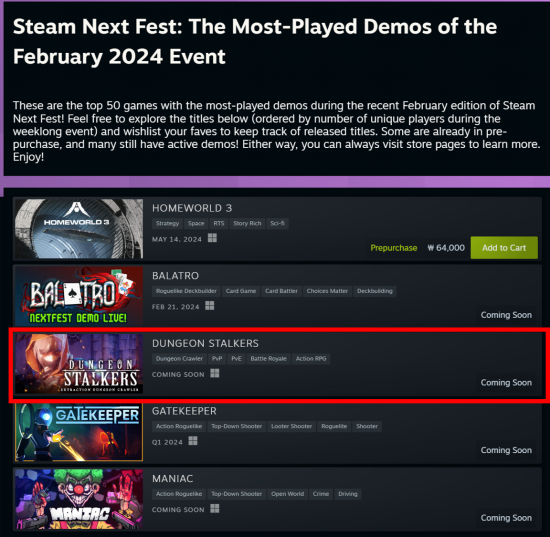 ¾×¼Ç½ºÄù¾î°¡ °³¹ßÇÑ ´øÀü Å©·Ñ·¯ ½ÅÀÛ ¡®´øÀü½ºÅäÄ¿Á°¡ Áö³ ÇÑ ÁÖ°£ °¡Àå ¸¹ÀÌ Ç÷¹ÀÌ µÈ µ¥¸ð°ÔÀÓ(Top Demos of the week) Áß Çϳª·Î ¼±Á¤µÆ´Ù°í 15ÀÏ ¹àÇû´Ù.