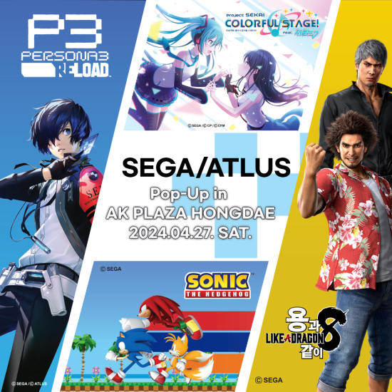 À̹ø ¡®SEGA/ATLUS POP UP in AK PLAZA HONGDAE¡¯¿¡¼´Â SEGA¿Í ATLUSÀÇ ´ëÇ¥ÀÛÀÎ ¡®¼Ò´Ð ´õ ÇìÁöȤ¡¯, ¡®¿ë°ú °°ÀÌ¡¯, ¡®Æä¸£¼Ò³ª ½Ã¸®Á, ¡®ÇÁ·ÎÁ§Æ® ¼¼Ä«ÀÌ¡¯ÀÇ ´Ù¾çÇÑ ±ÂÁî°¡ ÁغñµÇ¾î Çѱ¹ÀÇ ÆÒµéÀ» ¸ÂÀÌÇÒ ¿¹Á¤ÀÌ´Ù.