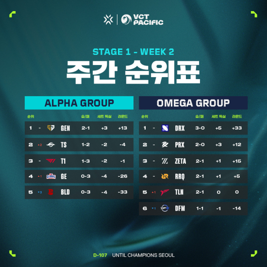 DRX°¡ À¯µ¶ T1¿¡ °ÇÑ ¸ð½ÀÀ» º¸ÀÌ¸é¼ Áö³ÇغÎÅÍ À̾îÁø ¿¬½Â ±â·ÏÀ» À̾´Ù. DRX´Â 13ÀÏ T1°ú Ä¡¸¥ VCT ÆÛ½ÃÇÈ ½ºÅ×ÀÌÁö 1¿¡¼ÀÇ Ã¹ Çѱ¹ ³»ÀüÀ» ½Â¸®ÇÏ¸é¼ 3Àü Àü½Â, ¼¼Æ® µæ½Ç +5¸¦ ±â·ÏÇß´Ù. DRX´Â 1ÁÖ Â÷¿¡ À̾î 2ÁÖ Â÷¿¡¼µµ ¿À¸Þ°¡ Á¶ 1À§ ÀÚ¸®¸¦ À¯ÁöÇÏ¸é¼ Ç÷¹ÀÌ¿ÀÇÁ ÁøÃâ È®Á¤±îÁö ´Ü 1½Â¸¸À» ³²°å´Ù.