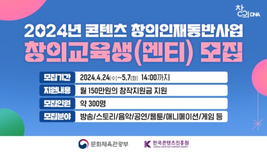 ¹®ÈüÀ°°ü±¤ºÎ¿Í Çѱ¹ÄÜÅÙÃ÷ÁøÈï¿ø(ÀÌÇÏ ÄÜÁø¿ø)Àº ¡®2024 ÄÜÅÙÃ÷ âÀÇÀÎÀ絿¹Ý»ç¾÷(ÀÌÇÏ Ã¢ÀÇÀÎÀ絿¹Ý»ç¾÷)¡¯¿¡ Âü¿©ÇÒ 300¸íÀÇ Ã¢ÀÇ ±³À°»ýÀ» ¿À´Â 5¿ù 7ÀϱîÁö ¸ðÁýÇÑ´Ù.