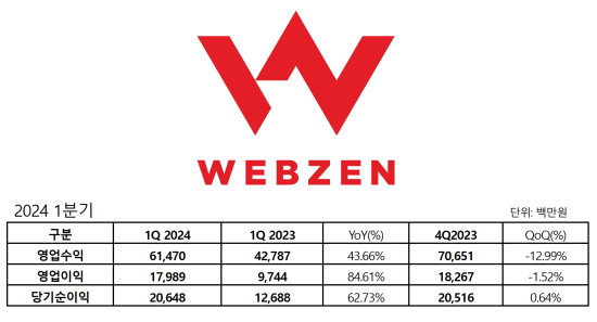 [À¥Á¨] 2024³â 1ºÐ±â ½ÇÀû ¹ßÇ¥, ¿µ¾÷¼öÀÍ 614¾ï ¿ø, ´ç±â¼øÀÌÀÍ 206¾ï ¿ø |