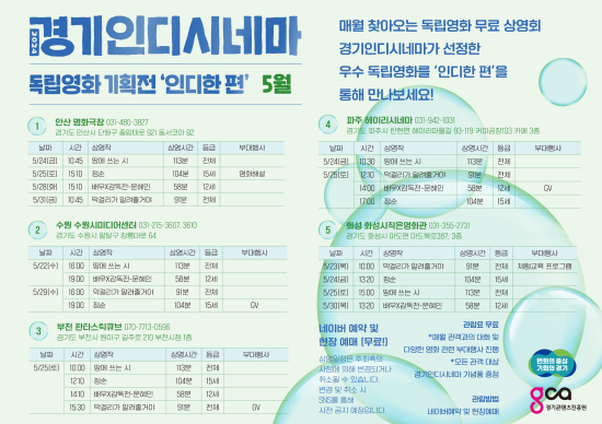 ¡®ÀεðÇÑ Æí'Àº °æ±âµµÀÇ ´Ù¾ç¼º ¿µÈ ¹è±Þ¡¤»ó¿µ Áö¿ø »ç¾÷ÀÎ °æ±âÀεð½Ã³×¸¶ »ç¾÷ÀÇ ÀÏȯÀ¸·Î, ¸Å¿ù ¿ì¼öÇÑ À塤´ÜÆí Çѱ¹ µ¶¸³¿µÈµéÀ» ¼±Á¤ÇØ °æ±âµµ °÷°÷ÀÇ »ó¿µ°ü¿¡¼ ¹«·á·Î »ó¿µÇÏ´Â ±âȹÀüÀÌ´Ù.