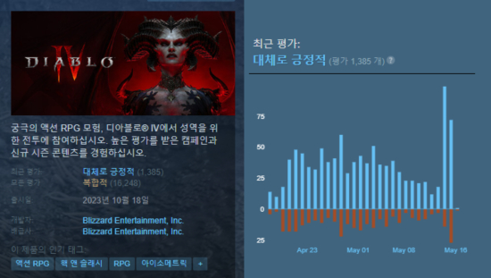 ºí¸®ÀÚµå ¿£ÅÍÅ×ÀÎ¸ÕÆ®°¡ °³¹ßÇÏ°í ¼ºñ½ºÇÏ´Â Çپؽ½·¡½Ã RPG 'µð¾Æºí·Î 4'°¡ 5¿ù 15ÀÏ ³× ¹øÂ° ½ÃÁð 'Àü¸®Ç°ÀÇ Àçź»ý'À» ÅëÇØ À¯Àú Æò°¡¸¦ ȸº¹Çß´Ù. ¹ëºê ÄÚÆÛ·¹À̼ÇÀÌ ¿î¿µÇÏ´Â ±Û·Î¹ú PC °ÔÀÌ¹Ö Ç÷§Æû ½ºÆÀ¿¡¼ 'µð¾Æºí·Î 4' À¯Àú Æò±Õ Æò°¡´Â 'º¹ÇÕÀû(Àüü Æò°¡ Áß ±àÁ¤ Æò°¡ 40~69%)'À̾úÀ¸³ª, ½Å±Ô ½ÃÁðÀÌ ½ÃÀÛµÈ ÈÄ '´ëü·Î ±àÁ¤Àû(Àüü À¯Àú Æò°¡ Áß ±àÁ¤ Æò°¡ 70~79%)'À¸·Î ȸº¹µÆ´Ù.