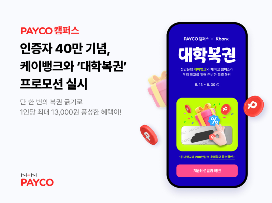 ¿£¿¡ÀÌÄ¡¿£ ÆäÀÌÄÚ(NHN PAYCO)°¡ ÆäÀÌÄÚ Ä·ÆÛ½º ´©Àû ÀÎÁõÀÚ 40¸¸ ¸í ´Þ¼ºÀ» ±â³äÇØ ÄÉÀ̹ðÅ©¿Í ÇÔ²² Àδç ÃÖ´ë 1¸¸ 3,000Æ÷ÀÎÆ®¸¦ Á¦°øÇÏ´Â ¡®´ëÇк¹±Ç¡¯ ÇÁ·Î¸ð¼ÇÀ» ¼±º¸ÀδÙ.