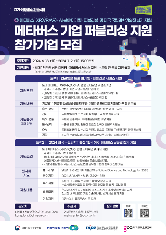 °úÇбâ¼úÁ¤º¸Åë½ÅºÎ¿Í °æ±âµµ, Á¤º¸Åë½Å»ê¾÷ÁøÈï¿øÀÌ Áö¿øÇÏ´Â À̹ø ¡®¸ÞŸ¹ö½º ±â¾÷ ÆÛºí¸®½Ì Áö¿ø¡¯ »ç¾÷Àº ¡ã¡®¸ÂÃãÇü ÄÁ¼³ÆÃÀ» ÅëÇÑ ¸¶ÄÉÆÃ¡¤ÆÛºí¸®½Ì Áö¿ø¡¯ ¡ã¡®2024 ű¹ ±¹¸³°úÇбâ¼úÀü Çѱ¹ XR/¸ÞŸ¹ö½º °øµ¿°ü Âü°¡ Áö¿ø¡¯ µî 2°³ ºÐ¾ß ÃÑ 8°³ »ç¸¦ Áö¿øÇÑ´Ù.
