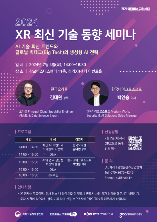 XR Ãֽűâ¼úµ¿Çâ ¼¼¹Ì³ª´Â XR°ú ¸ÞŸ¹ö½º ±â¼ú °ü·Ã Ãֽе¿Çâ ¹× ºñÀüÀ» °øÀ¯ÇÏ´Â Çà»çÀÌ´Ù. À̹ø ¼¼¹Ì³ª¿¡¼´Â ¡®AI ±â¼ú ÃֽŠƮ·»µå¿Í ±Û·Î¹ú ºòÅ×Å©ÀÇ »ý¼ºÇü AI Àü·«¡¯À» ÁÖÁ¦·Î Çѱ¹¸¶ÀÌÅ©·Î¼ÒÇÁÆ® ¹éÀÎ¼Û ÀÌ»ç, Çѱ¹¿À¶óŬ ±èÅÂ¿Ï »ó¹«°¡ °¿¬À» ÁøÇàÇÑ´Ù.