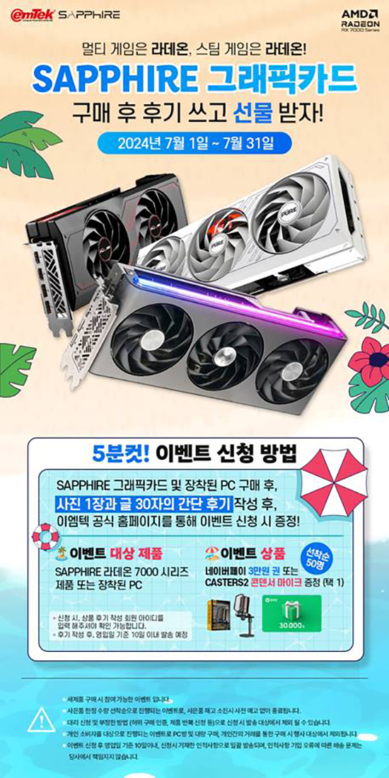 ÀÌ¿¥ÅؾÆÀÌ¿£¾¾´Â 7¿ù 1ÀϺÎÅÍ 31ÀϱîÁö SAPPHIRE ¶óµ¥¿Â RX 7000 ½Ã¸®Áî ±×·¡ÇÈÄ«µå ¶Ç´Â ÀåÂøµÈ PC ±¸¸Å ÈÄ Èıâ ÀÛ¼º ½Ã, ÀÌ¿¥ÅØ °ø½Ä ȨÆäÀÌÁö¸¬ ÅëÇØ ½ÅûÇÏ¸é ¡®³×À̹öÆäÀÌ 3¸¸¿ø¡¯ ¶Ç´Â ¡®CASTER2 Äܵ§¼ ¸¶ÀÌÅ©¡¯ ¸¦ ÁõÁ¤ÇÏ´Â À̺¥Æ®¸¦ ÁøÇàÇÑ´Ù ¹àÇû´Ù.