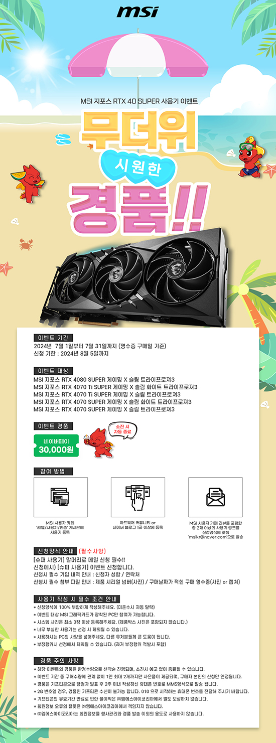 Çà»ç´Â 2024³â 7¿ù 1ÀϺÎÅÍ 7¿ù 31ÀϱîÁö ¡®MSI ÁöÆ÷½º RTX¢â 40 SUPER °ÔÀÌ¹Ö ½Ã¸®Á ±×·¡ÇÈÄ«µå¸¦ ±¸¸ÅÇÏ°í »ç¿ë±â¸¦ ÀÛ¼ºÇÏ´Â °í°´À» ´ë»óÀ¸·Î ÁøÇàµÈ´Ù. ÀÚ¼¼ÇÑ Çà»ç ´ë»ó Á¦Ç°Àº ¾Æ·¡¿Í °°´Ù.