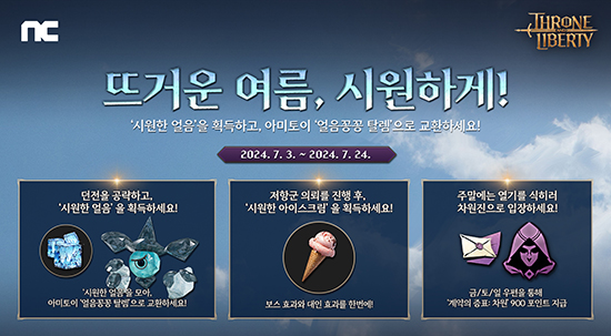 TL ÀÌ¿ëÀÚ´Â 7¿ù 24ÀϱîÁö ¡®¶ß°Å¿î ¿©¸§, ½Ã¿øÇϰÔ!¡¯ À̺¥Æ®¸¦ Áñ±æ ¼ö ÀÖ´Ù. 1¼º, 2¼º Çù·Â ´øÀü °ø·«¿¡ ¼º°øÇÏ¸é º¸½º »óÀÚ¿¡¼ ¡®½Ã¿øÇÑ ¾óÀ½¡¯À» ¾ò´Â´Ù. ¡®½Ã¿øÇÑ ¾óÀ½¡¯Àº ¸¶À»ÀÇ NPC(Non Player Character)¸¦ ÅëÇØ ¡â¾Æ¹ÌÅäÀÌ ¡®¾óÀ½²Ç²Ç Å»·½¡¯ ¡âƯ¼º °³¹æ¼®(±â°£ ³» ÃÖ´ë 60°³) ¡âÁø±ÍÇÑ ÀçÁú Àç·á ¼±Åà »óÀÚ µîÀ¸·Î ¹Ù²Ü ¼ö ÀÖ´Ù.