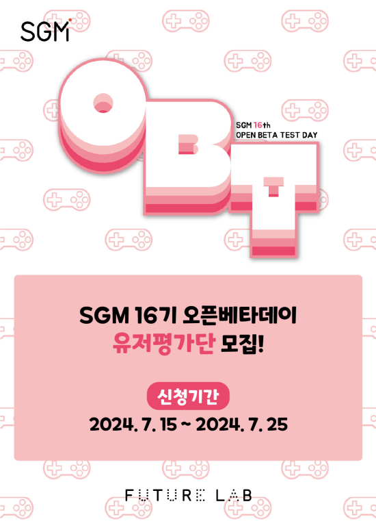 À̹ø OBT´Â 7¿ù 30ÀϺÎÅÍ 8¿ù 11ÀϱîÁö 13Àϰ£ ¿Â¶óÀÎÀ¸·Î ÁøÇàµÈ´Ù. Âü°¡ÀÚµéÀº ÇØ´ç ±â°£ Áß SGM 16±â°¡ °³¹ß ÁßÀÎ °ÔÀÓµéÀ» Ç÷¹ÀÌ Çϰí Á¦½ÃµÈ ¼³¹®¿¡ µû¶ó ´äº¯À» ÀÛ¼ºÇØ Á¦ÃâÇÏ¸é µÈ´Ù. ¼³¹® ³»¿ëÀº SGM 16±â¿¡ Àü´Þ µÇ¸ç, °ÔÀÓÀÇ Ç°Áú °³¼±À» À§ÇÑ ¾÷µ¥ÀÌÆ® µî¿¡ Ȱ¿ëµÉ ¿¹Á¤ÀÌ´Ù.