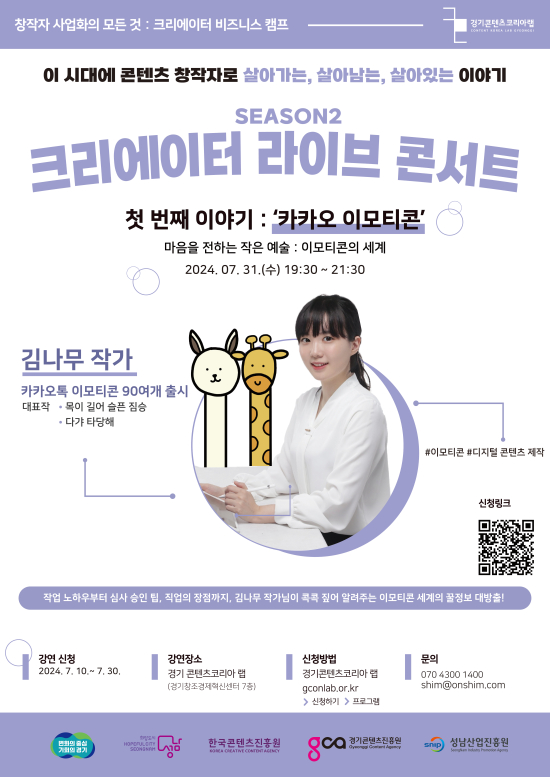 7¿ù 31ÀÏ ¿ÀÈÄ 7½Ã 30ºÐ¿¡ ¿¸®´Â ù °¿¬Àº ±è³ª¹« À̸ðƼÄÜ ÀÛ°¡ÀÇ ¡®Ä«Ä«¿À À̸ðƼÄÜ ¼öÀÍÈ¡¯¸¦ ÁÖÁ¦·Î ÁøÇàÇÑ´Ù. Æò¹üÇÑ È¸»ç¿øÀ̾ú´ø ±è³ª¹« ÀÛ°¡´Â Åð»ç ÀÌÈÄ ¡®¸ñÀÌ ±æ¾î ½½Ç Áü½Â¡¯ À̸ðƼÄÜÀ» Ãâ½ÃÇØ ¼ÒÀ§ ¡®´ë¹Ú¡¯À» ÅͶ߷ȴÙ. ÀÌÈÄ ÇöÀç±îÁö 90¿© °³ÀÇ À̸ðƼÄÜÀ» Ãâ½ÃÇϰí, Àú¼ <¹«Á¶°Ç µ· ¹ö´Â īī¿À À̸ðƼÄÜ ¸¸µé±â>¸¦ Ãâ°£ÇÏ´Â µî 8³â°£ âÀÛÀÚ·Î ²ÙÁØÈ÷ Ȱµ¿Çϰí ÀÖ´Ù.