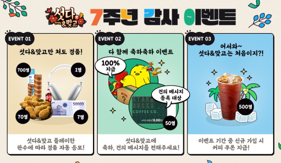 ¡®ÇѰÔÀÓ ¼¸´Ù&¸Â°í¡¯°¡ ÁغñÇÑ 7Áֳ⠱â³ä °¨»ç À̺¥Æ®´Â ¡ãÃàÇÏ ¸Þ½ÃÁö À̺¥Æ®, ¡ã´©Àû Ç÷¹ÀÌ À̺¥Æ®, ¡ã½Å±Ô °¡ÀÔ À̺¥Æ®±îÁö ÃÑ 3Á¾ÀÌ´Ù. À̺¥Æ®´Â 8¿ù 12ÀϱîÁö ÁøÇàµÈ´Ù.