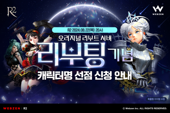 À¥Á¨Àº ¿À´Ã(8¿ù 14ÀÏ) 20½ÃºÎÅÍ ¿À´Â 18ÀϱîÁö ij¸¯ÅÍ¸í ¼±Á¡ À̺¥Æ®¸¦ ½Ç½ÃÇÑ´Ù. ij¸¯ÅÍ¸í ¼±Á¡ ½ÅûÀº R2 ȸ¿øÀ̶ó¸é ´©±¸³ª Âü¿©ÇÒ ¼ö ÀÖ´Ù. ÇØ´ç À̺¥Æ®´Â °èÁ¤ ·Î±×ÀÎ ÈÄ ¡®Ä³¸¯ÅÍ¸í ¼±Á¡Çϱ⡯ ÅÇÀ» ÅëÇØ °èÁ¤´ç 1ȸ, ij¸¯ÅÍ 1°³ ÇÑÁ¤À¸·Î ½Åû °¡´ÉÇÏ´Ù.