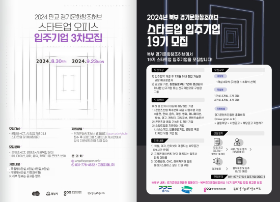 ¿ì¼±, ¼º³²½Ã °æ±ââÁ¶°æÁ¦Çõ½Å¼¾ÅÍ(ÆÇ±³¿ª)¿¡ À§Ä¡ÇÑ ¡®ÆÇ±³ °æ±â¹®ÈâÁ¶Çãºê¡¯¿¡¼´Â 9¿ù 23ÀϱîÁö µ¶¸³Çü(3¡¤4¡¤6¡¤9ÀνÇ) »ç¹«½Ç 7°³»ç, °³¹æÇü 4ÀÎ½Ç 3°³»ç, ÁöÁ¤¼® 11°³ Á¼®À» ¸ðÁýÇÑ´Ù. ¼±Á¤µÈ ±â¾÷Àº 11¿ùºÎÅÍ ÀÔÁÖ °¡´ÉÇÏ´Ù. ICT(Á¤º¸Åë½Å±â¼ú)³ª AI(ÀΰøÁö´É)¿Í °áÇÕµÈ ÄÜÅÙÃ÷ ºÐ¾ß ½ºÅ¸Æ®¾÷À̸é Áö¿øÇÒ ¼ö ÀÖ´Ù.