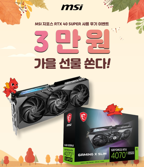 Çà»ç´Â 2024³â 10¿ù 1ÀϺÎÅÍ 10¿ù 31ÀϱîÁö ¡®MSI ÁöÆ÷½º RTX¢â 40 SUPER °ÔÀÌ¹Ö ½Ã¸®Á ±×·¡ÇÈÄ«µå¸¦ ±¸¸ÅÇÏ°í »ç¿ë ÈÄ±â ¹× Æ÷Åä »óǰÆòÀ» ÀÛ¼ºÇÏ´Â °í°´À» ´ë»óÀ¸·Î ÁøÇàµÈ´Ù. ÀÚ¼¼ÇÑ Çà»ç ´ë»ó Á¦Ç°Àº MSI ÁöÆ÷½º RTX¢â 4080 SUPER °ÔÀ̹ÖX ½½¸² Æ®¶óÀÌÇÁ·ÎÁ®3, MSI ÁöÆ÷½º RTX¢â 4070 Ti SUPER °ÔÀ̹ÖX ½½¸² Æ®¶óÀÌÇÁ·ÎÁ®3, MSI ÁöÆ÷½º RTX¢â 4070 Ti SUPER °ÔÀ̹ÖX ½½¸² ÈÀÌÆ® Æ®¶óÀÌÇÁ·ÎÁ®3, MSI ÁöÆ÷½º RTX¢â 4070 SUPER °ÔÀ̹ÖX ½½¸² Æ®¶óÀÌÇÁ·ÎÁ®3, MSI ÁöÆ÷½º RTX¢â 4070 SUPER °ÔÀ̹ÖX ½½¸² ÈÀÌÆ® Æ®¶óÀÌÇÁ·ÎÁ®3ÀÌ´Ù.