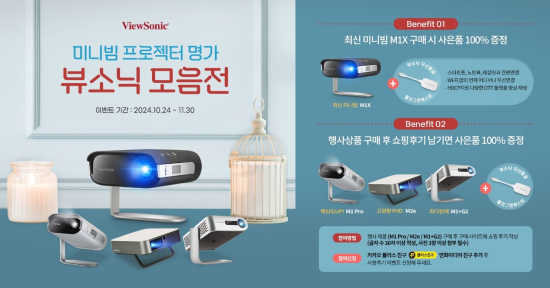 ºä¼Ò´Ð(ViewSonic)ÀÌ °¡À» Ä·ÇÎ ½ÃÁðÀ» ¸ÂÀÌÇØ ¹Ì´Ïºö ÇÁ·ÎÁ§ÅÍ Á¦Ç° Ưº° ÇÁ·Î¸ð¼ÇÀ» ÁøÇàÇÑ´Ù°í ¹àÇû´Ù. À̹ø ÇÁ·Î¸ð¼ÇÀº 2024³â 10¿ù 24ÀÏ (¸ñ) ~ 2024³â 11¿ù 30ÀÏ (Åä)±îÁö ºä¼Ò´Ð ³×À̹ö °ø½Ä ½ºÅä¾î¿¡¼ ¸¸³ªº¼ ¼ö ÀÖÀ¸¸ç, ÇÁ·Î¸ð¼Ç Àû¿ë Á¦Ç°Àº ÀÛÀº »çÀÌÁî, °¡º¿î ¹«°Ô, ¿øÈ°ÇÑ ¿¬°á ±â´ÉÀ¸·Î Ä·ÇÎ ½Ã ÈÞ´ëÇϱâ ÁÁÀº M1X, M1 Pro, M2e, M1+G2 ¹Ì´Ïºö ÇÁ·ÎÁ§ÅÍÀÌ´Ù.