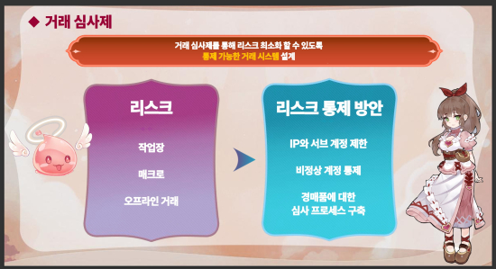 MMORPG °æÁ¦ ½Ã½ºÅÛÀÇ ÇÑ ÃàÀ» ´ã´çÇÏ´Â °Å·¡ ½Ã½ºÅÛ ¸®½ºÅ©¸¦ ÃÖ¼ÒÈ Çϱâ À§ÇØ IP ¹× ¼¹ö¿¡ µû¸¥ °èÁ¤ ¼ö¿¡ Á¦ÇÑÀ» µÖ ºñÁ¤»ó °èÁ¤À» ÅëÁ¦ÇØ ÀÛ¾÷ÀåÀ̳ª ¸ÅÅ©·Î¿¡ ´ëÇÑ ¸®½ºÅ©¸¦ ÃÖ¼ÒÈÇÑ´Ù. ¶ÇÇÑ °Å·¡ ½Ã½ºÅÛ ÇÁ·Î¼¼½º¸¦ ±¸ÃàÇØ °æ¸Å °ü·Ã À§Ç輺À» ÃÖ¼ÒÈ ÇÒ °èȹÀÌ´Ù.