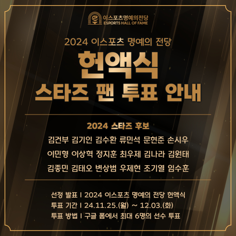 Çѱ¹e½ºÆ÷Ã÷Çùȸ°¡ ¿À´Â 12¿ù ¡®2024 À̽ºÆ÷Ã÷ ¸í¿¹ÀÇ Àü´ç Çå¾×½Ä¡¯ °³ÃÖ¸¦ ¾ÕµÎ°í ÆÒµéÀÌ Á÷Á¢ »Ì´Â ¿ÃÇØ ¡®½ºÅ¸Á ÅõÇ¥¸¦ 25ÀÏ(¿ù) ºÎÅÍ ½ÃÀÛÇÑ´Ù.