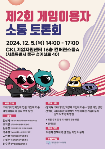 °ÔÀÓ¹°°ü¸®À§¿øÈ¸(ÀÌÇÏ '°ÔÀÓÀ§', À§¿øÀå ¼Å°Ç)´Â À̹ø ´Þ 5ÀÏ(¸ñ) ¿ÀÈÄ 2½ÃºÎÅÍ ¼¿ï CKL±â¾÷Áö¿ø¼¾ÅÍ 16Ãþ¿¡¼ '±¹³»´ë¸®ÀÎÁöÁ¤Á¦ ¹ý·ü °³Á¤¿¡ µû¸¥ °ÔÀÓÀÌ¿ëÀÚÀÇ ±ÇÀͺ¸È£ ¹æ¾È'À» ÁÖÁ¦·Î Åä·Ðȸ¸¦ °³ÃÖÇÑ´Ù.