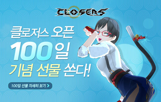 ¢ß³Ø½¼(´ëÇ¥ ¹ÚÁö¿ø)Àº ³ªµñ°ÔÀÓÁî(´ëÇ¥ Á¤½ÂÈÆ) °³¹ß ¾×¼Ç MORPG ¡®Å¬·ÎÀú½º(CLOSERS)¡¯ÀÇ ¼ºñ½º 100ÀÏÀÎ 4¿ù 1ÀÏÀ» ±â³äÇØ, 2ÀϺÎÅÍ À¯Àú°£´ãȸ¸¦ ºñ·ÔÇÑ °¢Á¾ À̺¥Æ®¸¦ ÁøÇàÇÑ´Ù. ¸ÕÀú 2ÀϺÎÅÍ 9ÀϱîÁö °ÔÀÓ Á¢¼ÓÀÚ¿¡°Ô ¡®°ËÀº¾ç 100ÀÏ ±â³ä ÀÎÇü¡¯ ÄÚ½ºÆ¬, ¡®³¯¾Æ´Ù´Ï´Â ¾¾¾Ñ¡¯ 100°³¸¦ Áö±ÞÇÑ´Ù. ¶ÇÇÑ, ij¸¯Åͺ° °³¼º¿¡ ¸Â´Â ½Å±Ô µ¿ÀÛ ¡®100ÀÏ Ã㡯À» Ãß°¡Çß´Ù.