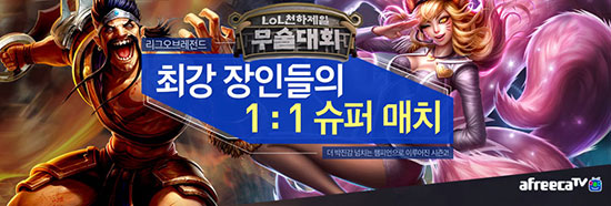 ¶óÀÌºê ¼Ò¼È ¹Ìµð¾î ¾ÆÇÁ¸®Ä«TV°¡ <¸®±× ¿Àºê ·¹Àüµå(ÀÌÇÏ LoL)>ÀÇ Ã¨ÇǾð(ij¸¯ÅÍ)º° ÃÖ°ÀÚ¸¦ °¡¸®´Â ¡®LoL õÇÏÁ¦ÀÏ ¹«¼ú´ëȸ¡¯ ½ÃÁð2¸¦ °³ÃÖÇÑ´Ù. À̹ø ´ëȸ´Â 4¿ù 22ÀÏ(¼ö)ºÎÅÍ 6¿ù 10ÀÏ(¼ö)±îÁö ¸Å ÁÖ ÃÑ 8ȸ¿¡ °ÉÃÄ ÁøÇàµÇ¸ç, LoLÀÇ °³¼º ³ÑÄ¡´Â èÇǾðµé Áß ¡ã³ª¸£ ¡ã´Ï´Þ¸® ¡ãµå·¹ÀÌºì ¡ã¾Ö´Ï ¡ãº£ÀÎ ¡ãÁ¦À̽º ¡ã¾Æ¸® ¡ãÀÚ¸£¹Ý4¼¼ ÃÑ 8Á¾ÀÇ Àαâ èÇǾðµéÀÇ ÃÖ°ÀÚ¸¦ ¼±¹ßÇÑ´Ù. ¼Ö·Î·©Å© ´ÙÀ̾Æ5Ƽ¾î ÀÌ»óÀÇ ¾ÆÇÁ¸®Ä«TV ȸ¿øÀÌ¸é ´©±¸³ª ´ëȸ Âü°¡ ½Åû ÇÒ ¼ö ÀÖÀ¸¸ç, LOL õÇÏÁ¦ÀÏ ¹«¼ú´ëȸ ½ÃÁð2 ÆäÀÌÁö(http://lol1vs1.afreeca.com/) ³» Âü°¡ ½Åû¼¸¦ ´Ù¿î·Îµå ÈÄ ½ÅûÇÒ ¼ö ÀÖ´Ù. ¸Å ȸ 1µîÀº 50¸¸¿øÀÇ »ó±ÝÀÌ ÁÖ¾îÁø´Ù. ù °æ±â·Î ¿À´Â 20(¿ù) ±îÁö Âü°¡ Á¢¼ö¸¦ ¿Ï·áÇÑ ¡®³ª¸£¡¯ èÇǾðÀÇ ÃÖ°ÀÚ ¼±¹ßÀüÀÌ 4¿ù 22ÀÏ(¼ö) ½ÃÀ۵Ǹç, ÀÌÈÄ ¸ÅÁÖ ¼ö¿äÀÏ Àú³á 10½Ã¿¡ PC ȨÆäÀÌÁö ¶Ç´Â ¸ð¹ÙÀÏ ¾ÛÀ» ÅëÇØ ¸¸³¯ ¼ö ÀÖ´Ù. ƯÈ÷, èÇǾ𺰠ÆÒ¾ÆÆ® ´ëȸ¿Í õÇÏÁ¦ÀÏ·¹À̵𠼱¹ß µî ÆÒµéÀ» À§ÇÑ ´Ù¾çÇÑ Áñ±æ°Å¸®¸¦ Á¦°øÇÑ´Ù. ÆÒ¾ÆÆ® ´ëȸ´Â õÇÏÁ¦ÀϹ«¼ú´ëȸ ½ÃÁð2¿¡ ¼±¹ßµÈ Àαâ èÇǾðÀ» ÆÒ¾ÆÆ®·Î ÀÚÀ¯·Ó°Ô ±×¸®¸é µÈ´Ù. ´ëÇ¥ÀÛÀ¸·Î ¼±Á¤µÈ ÆÒ¾ÆÆ®´Â 50¸¸¿øÀÇ »ó±ÝÀÌ Á¦°øµÈ´Ù. ¶ÇÇÑ ÃµÇÏÁ¦ÀÏ·¹À̵ð´Â ¾ÆÇÁ¸®Ä«TV ¿©ÀÚ BJ ´©±¸³ª Áö¿ø °¡´ÉÇϸç, ¼±¹ß ½Ã ¼ÒÁ¤ÀÇ È°µ¿ºñ ¹× ¹æ¼Û ¾ÆÀÌÅÛ Á¦°ø°ú ´õºÒ¾î ¹æ¼Û ½Ã LoL õÇÏÁ¦ÀÏ ¹«¼ú´ëȸ È«º¸ ¸ðµ¨·Î Ȱµ¿ ÇÒ ±âȸ¸¦ ÁØ´Ù. ÆÒ¾ÆÆ® ´ëȸ¿Í õÇÏÁ¦ÀÏ·¹À̵ð ¸ðµÎ LoL õÇÏÁ¦ÀÏ ¹«¼ú´ëȸ ½ÃÁð2 ƯÁý ÆäÀÌÁö¿¡¼ ¿À´Â 20ÀϱîÁö ½Åû ÇÒ ¼ö ÀÖ´Ù. LoL õÇÏÁ¦ÀϹ«¼ú´ëȸ ½ÃÁð2ÀÇ °æ±â´Â °ø½Ä ¹æ¼Û±¹ ä³Î(http://www.afreeca.com/aflol1vs1)¿¡¼ »ýÁ߰踦 ÅëÇØ PC¿Í ¸ð¹ÙÀÏ·Î ´©±¸³ª ¹«·á·Î ½ÃûÀÌ °¡´ÉÇÏ´Ù.