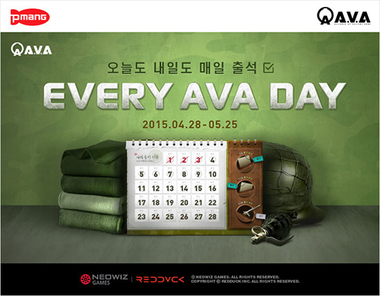 ¢ß³×¿ÀÀ§Áî°ÔÀÓÁî(´ëÇ¥ ÀÌ±â¿ø)´Â °ÔÀÓÆ÷ÅÐ ÇǸÁÀÌ ¼ºñ½ºÇϰí, ¢ß·¹µå´ö(´ëÇ¥ ¿À½ÂÅÃ)ÀÌ °³¹ßÇÑ ¹Ð¸®Å͸® FPS(1ÀÎĪ ½´ÆÃ)°ÔÀÓ <¾Æ¹Ù(A.V.A)>¿¡¼ °¡Á¤ÀÇ ´ÞÀ» ¸Â¾Æ °ÔÀÓ¿¡ Á¢¼ÓÇÏ´Â ÀÌ¿ëÀڵ鿡°Ô ǪÁüÇÑ ÇýÅÃÀ» Á¦°øÇÏ´Â ¡®EVERY A.V.A DAY¡¯ À̺¥Æ®¸¦ ½Ç½ÃÇÑ´Ù°í 28ÀÏ(È)¹àÇû´Ù. <¾Æ¹Ù(A.V.A)> ȸ¿øÀ̶ó¸é ´©±¸³ª ¿À´Â 5¿ù 25ÀÏ(¿ù)±îÁö ¾à ÇÑ ´Þ°£ °ÔÀÓ¿¡ Á¢¼ÓÇØ 30ºÐ°£ Ç÷¹ÀÌ ÇÒ °æ¿ì À̺¥Æ®¿¡ Âü¿©ÇÒ ¼ö ÀÖ´Ù. 30ºÐ°£ °ÔÀÓÀ» Áñ±ä µÚ À̺¥Æ® ÆäÀÌÁö¿¡¼ Ãâ¼® µµÀåÀ» ÂïÀ¸¸é °ÔÀÓ¸Ó´Ï, ¹æ¾î±¸ ¼¼Æ® ¾ÆÀÌÅÛÀ» ºñ·ÔÇØ °æÇèÄ¡, °ÔÀÓ¸Ó´Ï »ó½Â È¿°ú°¡ ÀÖ´Â ¾ÆÀÌÅÛÀ» ¹«ÀÛÀ§·Î ¹ÞÀ» ¼ö ÀÖ´Ù. »Ó¸¸ ¾Æ´Ï¶ó, 5ÀÏ, 10ÀÏ, 20Àϰ£ ´©Àû Ãâ¼®ÇÑ ÀÌ¿ëÀÚ´Â °ÔÀÓ ³» ´Ù¾çÇÑ ¾ÆÀÌÅÛÀ» ±¸¸ÅÇÒ ¼ö ÀÖ´Â ·¹µå ƼÄϰú Ȳ±Ý·æ Ãѱ⸦ Æ÷ÇÔÇÑ 15Á¾ÀÇ ¿µ±¸ ÃÑ±â ¹× ½ºÅ²ÀÌ ¹«ÀÛÀ§·Î ÁÖ¾îÁö´Â AK¹Ì½ºÅ׸® ¹Ú½º µîÀ» Ãß°¡·Î ¹ÞÀ» ¼ö ÀÖ´Ù. À̹ø <¾Æ¹Ù(A.V.A)>ÀÇ °¡Á¤ÀÇ ´Þ ¸ÂÀÌ ¡®EVERY A.V.A DAY¡¯¿¡ ´ëÇÑ º¸´Ù ÀÚ¼¼ÇÑ »çÇ×Àº °ø½Ä ȨÆäÀÌÁö(http://ava.pmang.com)¿Í ÆäÀ̽ººÏ(https://www.facebook.com/avakorea)¿¡¼ È®ÀÎÇÒ ¼ö ÀÖ´Ù.