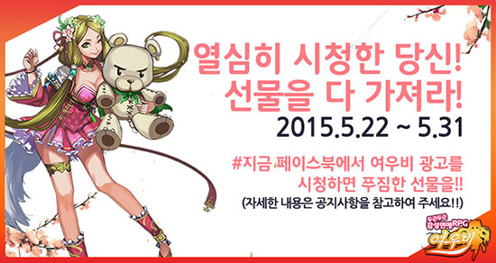 ¢ß³Ø½ºÆ®¹«ºê´Â Àڻ簡 ±¸±ÛÇ÷¹ÀÌ, Ƽ½ºÅä¾î, ³×À̹ö ¾Û½ºÅä¾î, KT ¿Ã·¹¸¶ÄÏÀ» ÅëÇØ ¼ºñ½º ÁßÀÎ ¸ð¹ÙÀÏ °¨¼º¿¬¾Ö RPG ¡®¿©¿ìºñ'°¡ ¡®¿½ÉÈ÷ ½ÃûÇÑ ´ç½Å, ¼±¹°À» ´Ù °¡Á®¶ó!¡¯ À̺¥Æ®¸¦ ÁøÇàÇÑ´Ù°í ±ÝÀÏ(26ÀÏ) ¹àÇû´Ù. °¨¼ºÀûÀÎ ¿ä¼Ò¸¦ ´ãÀº MMORPG·Î ¸¹Àº ÁÖ¸ñÀ» ¹ÞÀ¸¸ç Á¤½Ä ¼ºñ½º¸¦ ½ÃÀÛÇÑ ¡®¿©¿ìºñ'´Â ÃÖ±Ù ÄÉÀ̺íTV¸¦ ÅëÇØ CF ±¤°í¸¦ ÁøÇàÇÑ ÈÄ ¸¶ÄÏ Â÷Æ® ¿ªÁÖÇàÀÇ Àú·ÂÀ» ¹ßÈÖÇϸç, ±¸±ÛÇ÷¹ÀÌ Àα⠹«·á »óÀ§±Ç¿¡ ¿À¸£´Â ¹«¼¿î µÞ½ÉÀ» ¹ßÈÖÇϰí ÀÖ´Ù. ÀÌ·¯ÇÑ Àα⿡ ÈûÀÔ¾î ¡®¿©¿ìºñ'´Â CF ¿µ»ó¿¡ °üÇÑ À̺¥Æ®¸¦ ¸¶·ÃÇÏ¿© °£´ÜÇÑ Âü¿© ¹æ¹ýÀ¸·Î À¯Àú Àü¿ø¿¡°Ô dz¼ºÇÑ ÇýÅÃÀ» Á¦°øÇÑ´Ù´Â ¸ñÀûÀÌ´Ù. ¡®¿½ÉÈ÷ ½ÃûÇÑ ´ç½Å, ¼±¹°À» ´Ù °¡Á®¶ó!¡¯¶ó°í ¸í¸íµÈ À̹ø À̺¥Æ®´Â ³Ø½ºÆ®¹«ºê °ø½Ä ÆäÀ̽ººÏ¿¡ °ÔÀçµÈ ¡®¿©¿ìºñ'ÀÇ CF ¿µ»ó °Ô½Ã±Û¿¡ ÁÁ¾Æ¿ä¸¦ Ŭ¸¯ÇÑ ÈÄ, ÇØ´ç ±¤°íÀÇ ¸ÞÀÎ ½½·Î°ÇÀ» ´ñ±Û·Î ÀÛ¼ºÇÏ¿© Âü¿©ÇÒ ¼ö ÀÖ´Ù. ÇØ´ç À̺¥Æ®´Â ¿À´Â 5¿ù 31ÀÏ(ÀÏ)±îÁö ÁøÇàµÇ¸ç, À̺¥Æ®¸¦ ÅëÇØ ÆäÀ̽ººÏ ÁÁ¾Æ¿ä¸¦ Ŭ¸¯ÇÑ À¯Àú Àü¿ø¿¡°Ô ½Â±Þ´Ü 25°³ ÄíÆùÀ» Áö±ÞÇϰí, ´ñ±ÛÀ» ÀÛ¼ºÇÑ À¯Àú ¸ðµÎ¿¡°Ô500¿øº¸ ÄíÆùÀ» 100% ÁõÁ¤ÇÑ´Ù. ÇÑÆí, ±âÁ¸ RPG¿¡ Ưº°ÇÏ°í ´ÞÄÞÇÑ Å׸¶ÀÎ °¨¼º¿¬¾Ö¸¦ ´õÇÑ '¿©¿ìºñ'´Â RPGÀÇ ¹ÚÁø°¨ ³ÑÄ¡´Â ÀüÅõ¸¦ ±×´ë·Î °è½ÂÇÔ°ú µ¿½Ã¿¡ ¼øÁ¤¸¸ÈÀÇ Ä³¸¯Å͸¦ º¸´ÂµíÇÑ ¾Æ±âÀÚ±âÇÏ°í ±Í¿©¿î ij¸¯ÅÍ·Î °¨¼ºÀ» ´õÇØ ³²³à³ë¼Ò¸¦ ¸··ÐÇÏ°í ³ÐÀº À¯Àú Ãþ¿¡°Ô ¿©ÀüÈ÷ ³ôÀº Àα⸦ ¾ò°í ÀÖ´Ù. ³Ø½ºÆ®¹«ºêÀÇ °ü°èÀÚ´Â "ÃÖ±Ù ¿©¿ìºñÀÇ CF ±¤°í ÁøÇà ÈÄ ¿©¿ìºñÀÇ Àα⠼øÀ§°¡ ³ô¾ÆÁ® »óÀ§±ÇÀ» À¯ÁöÇϰí ÀÖ´Ù¡±¸ç, À̾î "À̸¦ ±â³äÇÏ¿© ¼Ò¼ÒÇÑ À̺¥Æ®¸¦ ¸¶·ÃÇßÀ¸´Ï ´ÞÄÞÇÑ CF ¿µ»óµµ °¨»óÇÏ½Ã°í °£´ÜÇÑ À̺¥Æ® Âü¿©·Î ÇýÅõµ ¹Þ¾Æ°¡½Ã±æ ¹Ù¶õ´Ù¡±¶ó°í ÀüÇß´Ù. ¡®¿©¿ìºñ¡¯¿¡ ´ëÇÑ ÀÚ¼¼ÇÑ ³»¿ëÀº ¸ð¹ÙÀÏ ÆäÀÌÁö(http://m.rain.nextmv.com)¿Í °ø½Ä ÆäÀ̽ººÏ(http://on.fb.me/1Abl8Ef)À» ÅëÇØ È®ÀÎÇÒ ¼ö ÀÖ´Ù.
